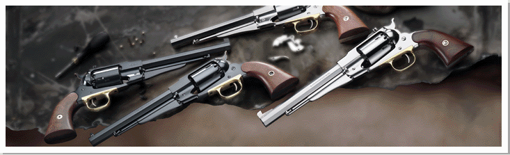 The manufacture of firearms by Remington goes back to 1816 when Eliphalet Reniington produced his first guns in Ilion, New York. Thanks to the talent of his designer, F. Beals, in 1858 he patented and started production of a revolutionary weapon: the 1858 NEW MODEL ARMY .44 cal.. As it happened for CoIt, also for Remington the Civil War represented a significant turn. Federa1 Government granted to “Remington & Sons, Ilion, N.Y.” license to develop and change the initial project. These guns became the veterans of the Civil War. They were appreciated for the strength of their rugged frame, and were ideallv suited for the heavy .44 cal. loads and for their shooting reliability and accuracy. The same gun was also produced in .36 cal. And, as it happened with Colt guns, it was the favorite of the American Navy which required small caliber guns for the hand to hand fights. Hence the name 1858 NEW MODEL NAVY .36 cal., given to distinguish it from the .44 cal. version. Our range covers also customized versions, fully idenfical in the mechanism but with small cosmetic variations, such as the 1858 NEW MODEL ARMY TARGET .36/.44 cal.,with adjustable front and rear sights, or like the 1858 NEW MODEL ARMY NICKEL .36/.44 ca1., available with a brass frame or steel frame. Another version is the 1858 NEW MODEL ARMY STAINLESS STEEL .36/.44 cal., designoci to better stand the wear caused by the black powder. This model is also available in the TARGET .44 cal. with stainless steel adjustable front and rear sights. For whoever prefers the long barrel revolvers, it is available the 1858 BUFFALO .44 cal. with brass frame or steel frame; the range is accomplished by the 1858 TEXAS .36/.44 cal. which features a brass frame.